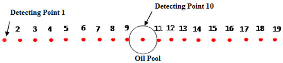 To obtain the size of radiation heat flux, different monitoring points are chosen for detection, the oil pool center (X = 7 m, Y = 7 m) is set up as the monitoring center, the 18 points along the X axis with an equal distance (1 m) of the oil pool are chosen as the detecting points, and the measured height is 1.65 m (assuming that the height of the person is 1.65 m). The locations of different points are shown in Figure 12.