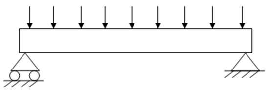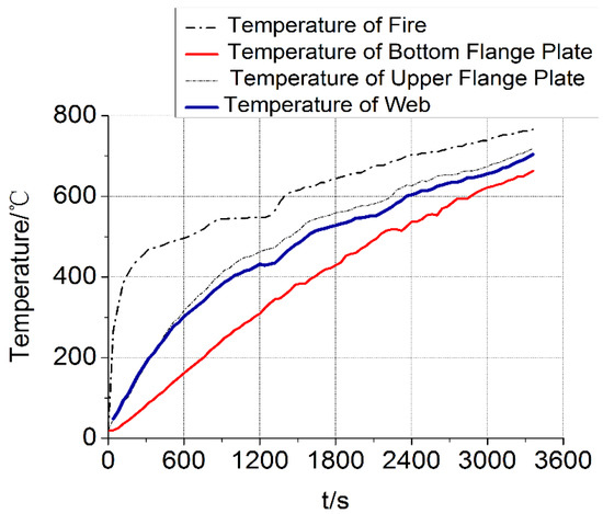 Before making the structural response analysis, the validity of the ABAQUS method should be verified. Because of the great fire experiment cost, therefore, we can verify the correctness of the ABAQUS method with the experiment results of Southeast University by Shuping Cong et al. In the experiment, Q235 I steel beam was mainly used (it is assumed to be the ideal type, one end is sliding hinged and the other end is hinged–fixed). The beam is placed in the oil-fired furnace to be heated by the constant load, whose value is 10 kN/m. The span of the beam is 4.2 m, the height of the web is 250 mm, and the thickness is 6 mm; the width of the flange plate is 125 mm, and the thickness of the flange plate is 9 mm. The beam loading and the loading temperature curve of the beam are shown in Figure 14 and Figure 15, respectively.