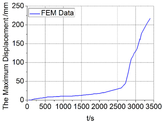 Figure 17 shows that the maximum displacement of the middle position of the steel structure increases linearly with the increase in temperature when the temperature is less than 600 °C. However, when the temperature is higher than 600 °C, the displacement changes rapidly, and then the displacement variable changes exponentially with the increase in temperature. Figure 18 shows that the displacement of steel structure members is small and smooth when the time is less than 2700 s; with time, the mutation of the displacement variation occurs at 2700 s and the displacement increases sharply, which indicates that the fire resistance time of the steel structure is 2700 s.