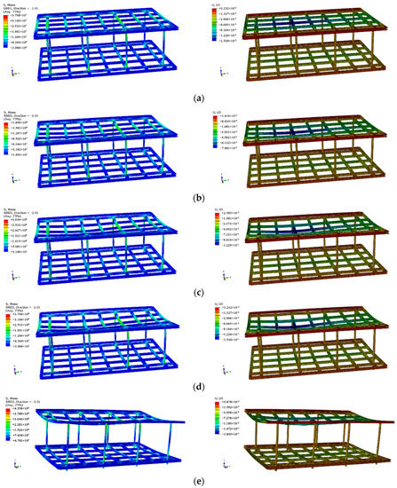 Figure 21 shows the stress and deformation of the structure at different times. As can be seen from Figure 21, the stress and deformation of the structure increase with the time of the fire; the region with the largest deformation after heating occurs in the middle T8 and T9 area, which is the first coverage area of the pool fire combustion. The maximum deformation occurs at the bottom of the third beam. In addition, the steel frame structure begins to suffer an obvious collapse phenomenon after the fire has been burning for 8000 s; the steel in the middle part of the upper deck is broken and the other transverse members extend to both sides. During the fire, the mechanical behavior of the steel is nonlinear. Although the steel itself will not burn, its properties will change greatly at high temperatures. When the temperature is 400, the yield strength will drop to the average at room temperature. When the temperature is 600 °C, the yield strength and elastic modulus drop to one-fifth of the room temperature, and the bearing capacity has been basically lost. According to Figure 11, the temperature of the platform in the fire can reach 600–1000 ºC, and the bearing capacity of steel greatly changes. During the whole combustion, the stress of steel changes and redistributes all the time. The joint position is the weak link of the steel frame in fire resistance, especially the stress concentration at the root of the beam flange at the junction of the beam and column, which has a great impact on the fire resistance bearing capacity of the beam.