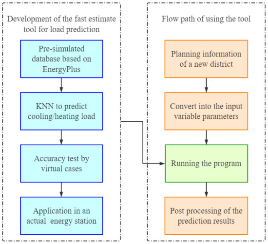 - Development of the KNN-algorithm-based method for load prediction: According to the planning information of the new community, the total building area of each design scenario in the district can be determined. For every single scenario, this paper proposes a new approach to predict the hourly specific cooling and heating load per building area of the whole year based on a machine learning method: the KNN algorithm. In this approach, the building model database established in Step (1) is used as the data source for KNN algorithm. This new method is finally developed into a practical fast estimate tool for cooling and heating load prediction in regional energy planning.