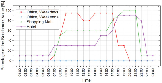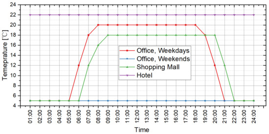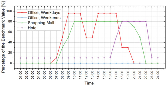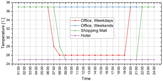 The parameters of indoor conditions that can affect the cooling and heating load include lighting power density, plug equipment power density, occupant density and indoor temperature set-points in summer and winter. On an hourly scale, these parameters basically change within a period of one day. Thus, they should be set in the form of “benchmark value + daily schedule”. The design standard for energy efficiency of public buildings in China provides the recommended values of these schedules in the computation of hourly cooling and heating load [36]. The benchmark values should be set by reference to the design scenario of the building. In this study, the load prediction tool provides 3 scenarios for each type of building for users to select in the scenario analysis. Table 4 shows the settings of the benchmark values corresponding to all scenarios. For the schedule settings, the daily variations are illustrated by Figure 3, Figure 4, Figure 5, Figure 6 and Figure 7, and Table 5 presents the operation time for the cooling and heating system in the buildings.