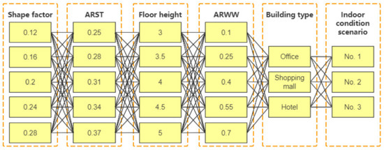 A total of 5625 groups of parameter values can be obtained by arranging all the above variable parameters of the building models (5 × 5 × 5 × 5 × 3 × 3 = 5625, as illustrated by Figure 8). Each group of parameter values corresponds to a BPS model in the presimulated database. In other words, the database used in this paper should store the information about the parameters of 5625 building models and their simulation results. The next subsection will demonstrate the process to generate such a database in detail.