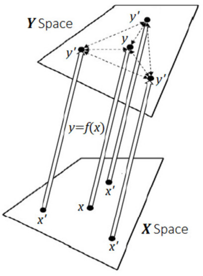The load prediction tool developed in this study is based on KNN algorithm. KNN is a nonparametric learning algorithm in machine learning, which is often used in classification and regression. The principle is as follows: for data space X and Y, when there is a linear or approximately linear mapping relation between X and Y (f: X→Y), an arbitrary y in Y (the mapping point of x in X) can be obtained through the interpolation calculation of a point set {y’} (a set of the mapping point of x’, which are the nearest neighbor points of x in X) (as illustrated by Figure 11). When there are enough data samples in the sample space, KNN algorithm has high accuracy. The presimulated database provides 5625 data samples, which is adequate to reflect the mapping relationship between X (the variable model parameters) and Y (hourly cooling and heating loads) in this study.