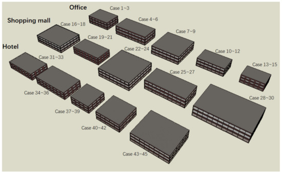 The developed tool requires a test to verify its accuracy and effectiveness. The test objects are 15 randomly generated BPS models with different input information. Among these 15 buildings, there are 5 of each type (office, shopping mall and hotel). For the sake of simplicity, the geometric parameters of the five models in each group are the same. In the load prediction tool, there are three kinds of settings to be chosen as the indoor condition scenarios for each type of building. Therefore, we arranged and combined these 15 virtual buildings with three different scenarios to create a total of 45 test cases. The model parameters of these test cases are presented in Table 6.