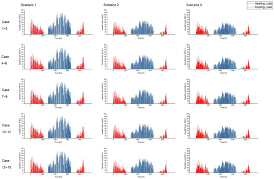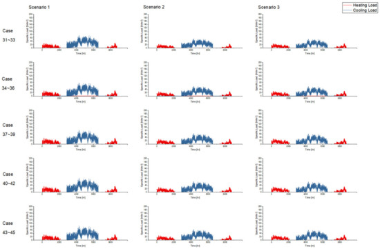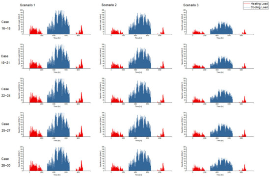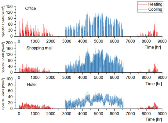 Predicted hourly specific cooling and heating loads of three types of buildings.