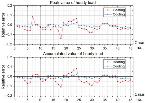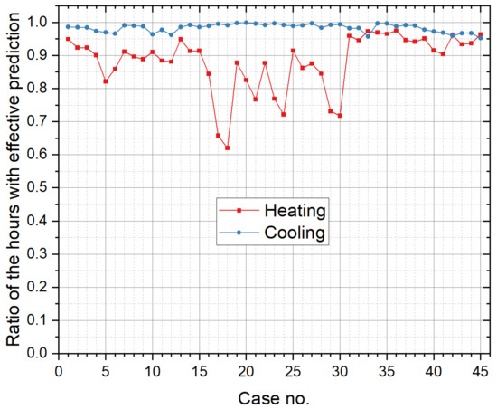 Figure 13, Figure 14 and Figure 15 illustrate the original prediction results of all the 45 cases. To show the overall condition of the prediction results, a line graph is used to illustrate the frequency distribution of “ratio of the hours with effective prediction” (Figure 16). Figure 17 presents the RE of the peak and the accumulated value of annual cooling and heating loads.