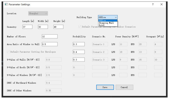 In this UI, users can input the length, width, height, the number of floors and the ARWW of the corresponding building to the highlighted load source. In the background of the software, the program will transfer the original geometric parameters (length, width and height) into the database parameters (shape factor, ARST and floor height). The building type for selection includes office, shopping mall and hotel, and after determining the building type, three default indoor scenarios will be displayed in the following boxes. At this time, the users need to input the probability of these scenarios. Obviously, some boxes in this UI are disable. For the parameter boxes of the envelopes and the indoor conditions, they are regarded as the constants for the application scenarios in this paper, so the values in these boxes are only used to exhibit the settings of the model parameters in the software. However, in further studies, we will expand the scale of the presimulated building model database to enable these values as the variable inputs. This provides an orientation for the software to upgrade.