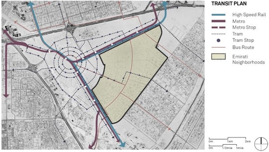 Interestingly, the new integrated public transport network proposed for the Capital District project incorporates advanced sustainable urban mobility strategies applied for the first time in Abu Dhabi, including high-speed rail, metro rail, and tram networks []. Once completed, the district is planned within a five-minute walk (300 m) from transit to all key destinations []. However, the project’s current stage of development does not include any advanced transit systems yet, likely due to the current phase being focused on the development of twelve low-density residential superblocks which rely on their street networks to support walkability and cycling, as mentioned in the project proposal (USDM, 2015 P.63) [].