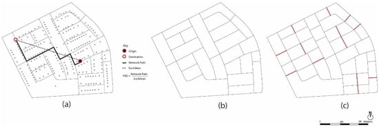 As earlier noted, two networks were used in this project. So, in addition to evaluating PRD and conducting PRD Tests on the base network (i.e., Network 1), we further evaluated the role of pedestrian network, sikkak, in providing efficient connectivity between origins and destinations. Previous local studies showed that sikkak break up long blocks in neighborhoods into smaller blocks, facilitating directness as demonstrated in several recent studies [,]. Considering these previous findings, the second network has added segments representing sikkak, as can be seen, in Figure 4c; sikkak were placed following a clear criterion. If the block’s faces were over 200 m long, a sikka should be added in the middle to break long blocks into smaller ones. As mentioned before, previous studies and policies of block size regulations limit measures to 200 m block face from through street to through street [,]. In addition, a “continuity principle”, adopted from previous studies, splits the blocks to create more continuous street centerlines [,].