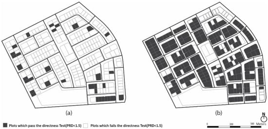 Following the results obtained using Network 1, the evaluation of the role of sikkak as added to Network 2, is presented in the last three columns of Table 3. It is clear from the results that sikkak makes a remarkable contribution to the efficiency of the neighborhood networks. Without exception, the neighborhoods’ percentage of passing plots exceeds 90% in ten of the studied neighborhoods, and only two cases show values below this percentage threshold and above 80%. Figure 4 illustrates the passing and failing plots in Superblock 3 using the two different networks.