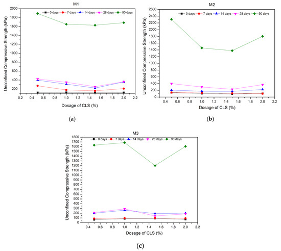 UCS tests were performed on clay–GS–CLS mixes at different curing periods of 0, 7, 14, 28, and 90 days. Figure 3 shows the behavior of for all combinations of clay–GS–CLS mix. For all GS dosages, 0.5% CLS yields a higher than other CLS dosages. But, at 2% CLS there is a slight increase in the strength prominently for 28 days and 90 days of curing for all dosages of GS. Besides this, M1 (Figure 3a) gains relatively higher strength when compared to M2 (Figure 3b) and M3 (Figure 3c) at all dosages of CLS.