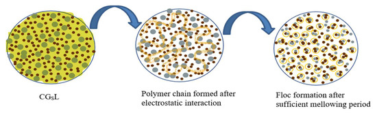 The hydrophilic compound CLS adsorbs the lattice elements of the clay mineral surface by electrostatic interaction (hydrogen bond, covalent bond, and cation exchange). CLS adsorbs on the mineral lattice elements and forms a polymer chain that binds the clay particles together and further agglomerates, as shown in Figure 4 and Figure 5 [29,31,36]. This phenomenon makes the virgin soil enhance less when added to the CLS compared to the working mechanism of the traditional stabilizers (lime, cement, and pozzolanic). These undergo a strong exothermic chemical reaction by forming calcium–silica compounds, which in turn increase the engineering properties of virgin soil. However, in both cases the microstructure of the treated soil changes to resist compressive loads [3,5].
