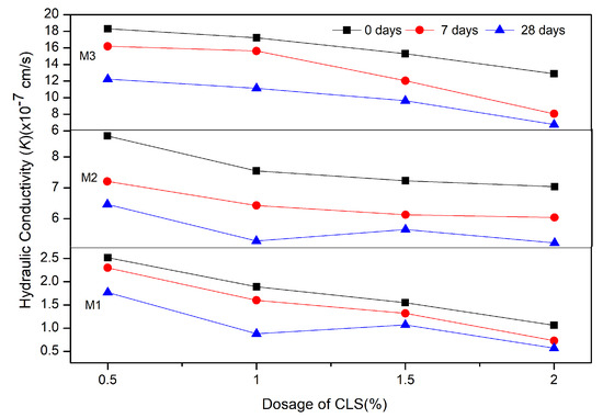 The hydraulic conductivity differs from the chemistry of infusing fluid [29]. The effect of CLS on varying clay–GS–CLS mixes is presented in Figure 7. The permeability of clay–GS–CLS mixes decreases with an increase in the dosage of CLS and the curing period. Simultaneously, an increase in the dosage of GS increases the conductivity. GS changes the particle distribution of the matrix, whereas CLS changes the soil structure [29,49,50]. With an increase in the curing period, the conductivity of binary blended clay is decreased as the CLS makes the matrix less compressible upon curing by binding the soil particles with a polymer chain, as depicted in Figure 4 and Figure 5. The aliquot fills the voids in the clay–GS matrix with the elapse of time by holding the clay–GS particles together with the polymer chain [27]. Similar work was performed by Nayak and Sarvade [41] where the permeability behavior of cement and quarry dust added to lithomargic clay was examined. The permeability of the treated soil was improved by 81% due to the 10% cement and 50% quarry dust. This work revealed that 30% GS and 0.5% CLS improve the permeability by 15 times, which is comparable to the calcium-based stabilizers wherein calcium salts of chloride, hydroxide, and carbonate are employed [51,52,53]; and non-calcium-based stabilizers involving biopolymers etc. [54,55].