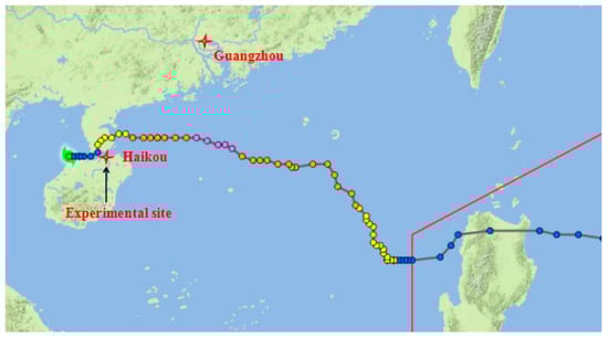 As reported by Wenzhou Typhoon Network of China (http://www.wztf121.com/ (accessed on 12 May 2022)), the Typhoon Khanun formed in waters near the east of the Philippines on 11 October 2017. It further intensified into a typhoon, reaching its peak intensity with the estimated maximum wind of level 10 near its center and the lowest central pressure of 988 hPa. Then, it landed in the coastal area in the east of Xuwen county, with the estimated maximum sustained winds of 28 m/s. Figure 1 presents the path of Typhoon Khanun.