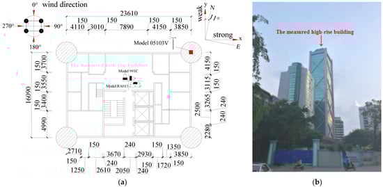 The high-rise building is located in the urban area of Haikou city, Hainan province. It is a huge, 32-story tower supported by four giant columns. It was completed in the 1990s. The measured building has a height of 108 m with the length–width ratio of 1.47 and the aspect ratio of 6.71, as shown in Figure 2.