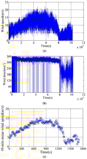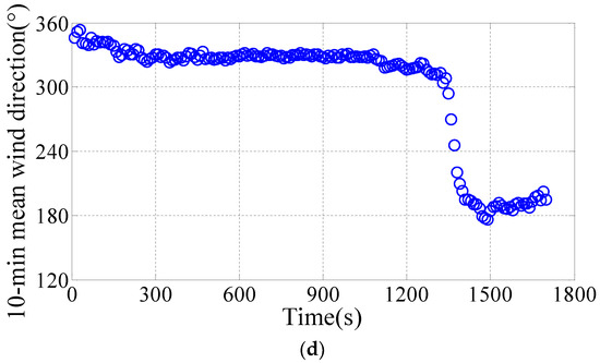 Wind field characteristics atop the building. (a) Wind speed; (b) Wind direction; (c) 10-min mean wind speed; (d) 10-min mean wind direction.