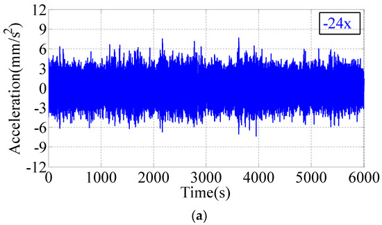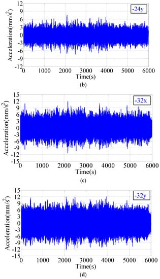 Time histories of the translational acceleration on the 6th, 12th, 18th, 24th, 30th and 32nd floors were measured, and Figure 6 illustrates the time histories of partially translational responses on the 24th and 32nd floors along the x and y axes at high wind speeds. The acceleration time history showed that the acceleration amplitude increased with the increasing wind speed and floor height. When the recorded wind speed reached its maximum value, namely, when the 10-min mean wind speed was about 15.0 m/s, the peaks of the maximum acceleration were 9.9 mm/s2 and 11.5 mm/s2 along x and y axes, respectively. In the process of typhoon landing, the peak acceleration in y direction is greater than the peak acceleration in x direction at the same measuring point. The main reason is that the y direction is a weak axis and the x direction is a strong axis, indicating that the acceleration response under the action of typhoon is closely related to the axial stiffness.