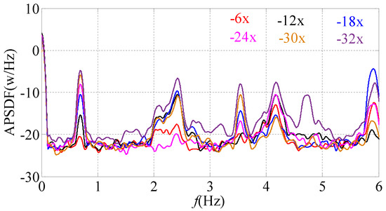 In order to show the measured acceleration power spectral density function (APSDF) of different floors better, the logarithmic spectrum (10 × log10(Pi)) is adopted for all data in vertical axis; Pi is the self-power spectral value (P) of the acceleration at the ith floor, the identification method is shown in detail in the literature (Li et al., 2018 [13]), and the specific identification of APSDF is shown in Figure 7. The wind energy during Typhoon Khanun is basically concentrated in the range of 0 Hz~1.0 Hz, and the first-order modal frequency of the x axis of measured high-rise building is 0.69 Hz. Because the wind energy is concentrated in the low frequency region, the measured first-order modal frequency is greatly affected. The measurement results show that the peak values of the first three resonant bandwidth frequencies increase significantly with the increasing wind speed.