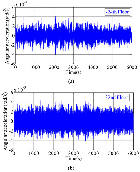 Time histories of angular acceleration response. (a) Angular acceleration of the 24th floor; (b) Angular acceleration of the 32nd floor.
