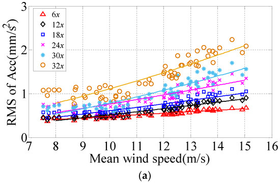 Figure 9 demonstrated the 10-min translational variations of the root-mean-square of acceleration (RMS of Acc) and peak acceleration on the 6th, 12th, 18th, 24th, 30th and 32nd floors at different wind speeds under Typhoon Khanun. Equation (1) was obtained by fitting the relationship between the RMS and peak of 10-min translational acceleration according to the power function curve, noting that the unit of acceleration is mm/s2: