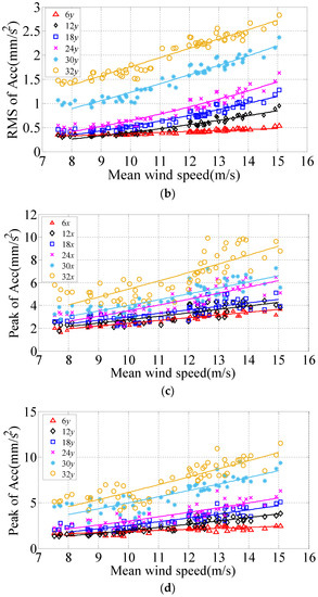 where is the RMS of Acc or peak acceleration; U is the 10-min mean wind speed; and c1 and c2 are the fitting parameters of Equation (1), and the fitting results of parameters are shown in Table 1. Figure 9a–d shows the relationships between RMS of Acc and peak accelerations with respect to the 10-min mean wind speed, which illustrated that both the 10-min RMS of Acc and peak acceleration increase in accordance with the power function as the wind speed increased along both the x and y axes.