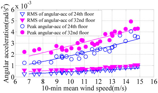 Figure 10 presented the 10-min torsional angular variations of the RMS of Acc and peak acceleration on the 24th and 32nd floors at different wind speeds under Typhoon Khanun. Table 2 illustrates the fitting parameters between torsional angular acceleration responses and mean wind speeds, noting that the unit of torsional angular acceleration is 10−3 rad/s2.