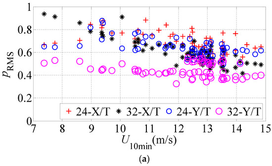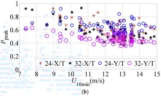 Figure 14a–c illustrates the acceleration peak factors along the x and y axes and torsional direction, which shows that peak factors were closely dependent to the set target guarantee rates. The increase of target guarantee rate resulted in the larger peak factor and discrete degree of the measured acceleration, and the peak factor of the building response was rarely relevant to the wind speed during the typhoon.