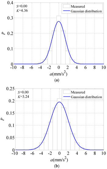 Based on the measured translational and torsional parameters on the 32nd floor of the object building, the overall sample probability distribution of acceleration time histories under Typhoon Khanun was obtained. The sample length was 10 h and the sampling frequency was 128 Hz. The acceleration probability density curves on the 32nd floor along both x and y axes are also presented in Figure 12. The skewness coefficient S and kurtosis coefficient K can be used to judge whether the measured time history data conforms to the Gaussian distribution, as they conform to the Gaussian distribution in the context of S = 0 and K = 3.