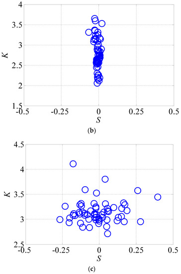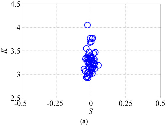 The overall sample probability distribution diagram illustrates that the probability distribution density at the top floor of the measured high-rise building was symmetrical and approximated to the Gaussian distribution. Provided that the point of the kurtosis and skewness coefficients deviate from (0, 3), then the sample probability distribution follows non-Gaussian characteristics. According to the Gaussian distribution, the peak factor is determined as 2.5 in the Load Code for the Design of Building Structures (GB 50009-2012, 2012), which has a target guarantee rate of 99.38%. Time histories of the 32nd floor were adopted to analyze the kurtosis and skewness coefficients of the acceleration probability density on condition that 10 min was selected as the basic time interval of the wind-induced response characteristics during typhoons, as shown in Figure 13.