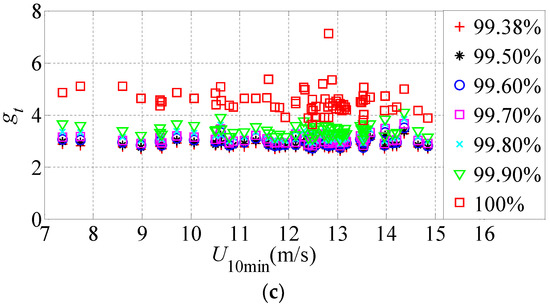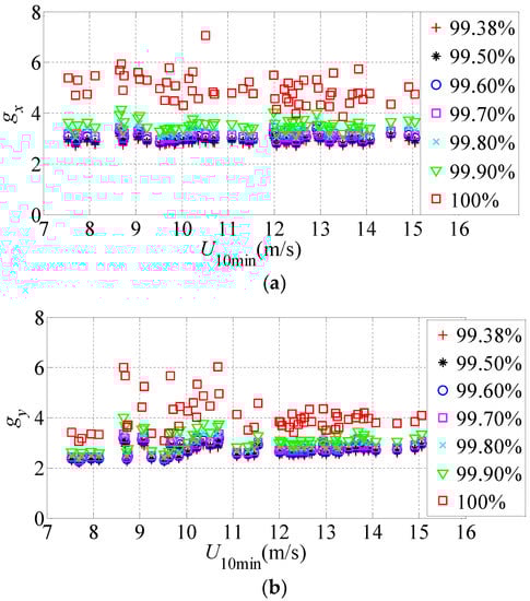 Figure 14 shows that the average values of acceleration peak factors gx, gy and gt were 2.86, 2.60 and 2.81, respectively, under a target guarantee rate of 99.38%, which exceeds the 2.5 determined in the Chinese code (GB50009-2012). The acceleration peak factor increased with the growth of target guarantee rate, and the peak factors gx, gy and gt were 4.95, 4.07 and 4.52, respectively, if the target guarantee rate was designated as 100%, which was also much greater than the 2.5 determined in the Chinese code, thus the measured acceleration peak factor under typhoon was greater than that designated in the Chinese code. Therefore, the acceleration peak factor was suggested to be 3.0 if the target guarantee rate was 99.38%, while it was suggested to be 5.0 when the target guarantee rate was 100.00%. Table 3 lists the average, maximum and minimum values of the acceleration peak factor under different target guarantee rates.