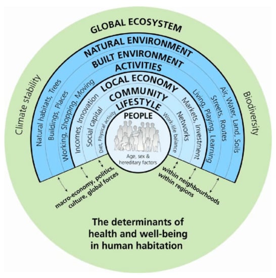 - Hancock, T. Health, Human Development and the Community Ecosystem: Three Ecological Models. Health Promot. Int. 1993, 8, 41–47. [Google Scholar] [CrossRef]