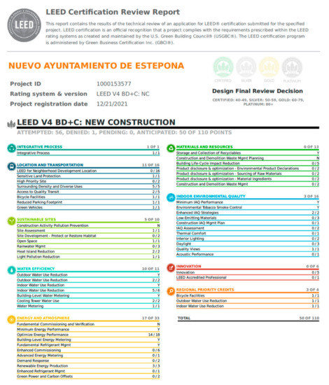 As a final reference support, we have availed of the documentation generated by the specialised consultancy in charge of verifying the degree of compliance with the certification criteria required by the Leadership in Energy and Environmental Design (LEED) accreditation seal and the results evaluation report (Figure 3).