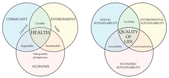 The third ecological model of human development presented by Hancock (1993) places health as an intersection between the community, the environment and the economy, with specific conditions to be met in each of these three domains in order to achieve a positive quality of life development [53]. This model could be reinterpreted as the degree of coincidence between social sustainability (enabling communities), environmental sustainability (embodied in the environment) and economic sustainability (available in resources) (Figure 5).