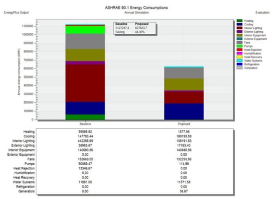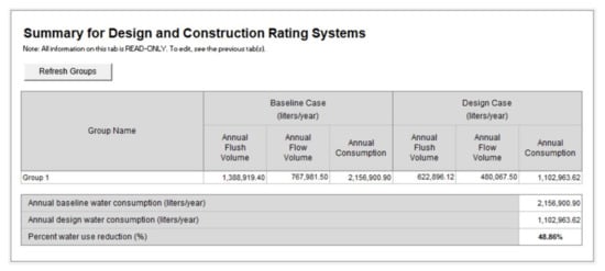 In relation to the demand for drinking water, the building’s consumption is reduced to a minimum by installing the most water-efficient toilets and taps available. After simulating the water consumption of the building, considering the hours of operation of the building (Monday to Friday, 8 a.m. to 3 p.m.) and the occupancy of the building (300 employees and 280 visitors during peak hours), an annual consumption with a percentage reduction in indoor water use of 48.86% compared to the standard commercial range was obtained (Figure 12).