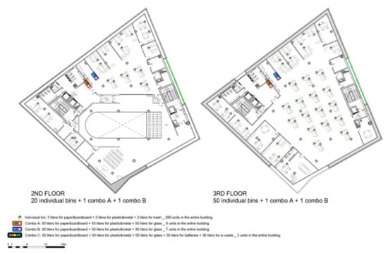 Finally, the need for the disposal of the waste generated has been identified as recyclable into different types of waste, and to be stored in the correct selective manner according to the number of occupants and spaces (Figure 13).