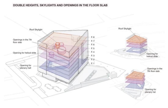As it is a consolidated urban area with existing infrastructure, the distance between the services is reduced, facilitating movement and access on foot or by bicycle, encouraging daily physical activity by users, with the resulting limitation of greenhouse gas emissions, air pollution and other environmental damage associated with public health. Typologically, it is a free-standing building with a total of eight floors above ground level for administrative use and a basement floor for parking services, with a built surface area of approximately one thousand square metres per floor (9300 m2 in total above ground level), a double-skin façade and a landscaped roof (Figure 7).