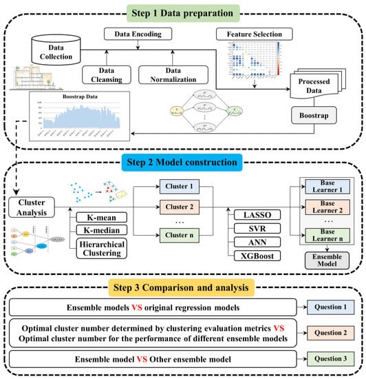 The second step is model construction. In this step, three clustering algorithms (K-means, K-medians, and Hierarchical clustering) and four regression models (LASSO, SVR, ANN, and XGBoost) are integrated, which generates 12 types of ensemble models. There are two reasons for selecting these specific clustering and regression algorithms. First, they are frequently used in the building energy field. Second, they are representative models based on different theories. These clustering algorithms and regression models are introduced in Section 2.3 and Section 2.4, respectively.