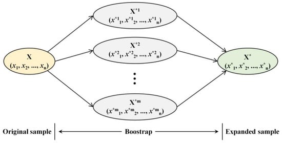 Bootstrap is a data expansion technology achieved by random resampling of the original data. More specifically, based on the collected data, a certain number of new samples are extracted each time through resampling. It should be noted that data can be repeatedly extracted more than once. Figure 2 shows a schematic of a typical bootstrap process. Each vector (e.g., x1) in the original dataset (i.e., X) includes all the inputs and outputs. Each bootstrap dataset (e.g., X*1) is generated by randomly sampling n times from the original dataset (i.e., X). This process is repeated m times until all the bootstrap datasets are generated [32].