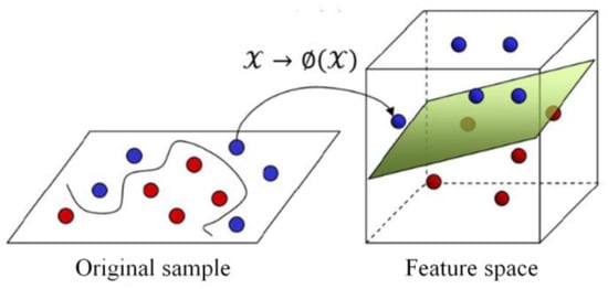Support Vector Regression (SVR) is a machine learning technique that was proposed by Vapnik et al. [37,38] based on statistical learning theory and the structural risk minimization principle. The basic idea of SVR is to introduce a kernel function, map the input space to a high-dimensional feature space through nonlinear mapping, and carry out linear regression on this feature space. This basic idea can be illustrated in Figure 4.