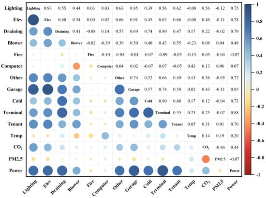As mentioned in Section 2.2, the collected data are processed by data cleansing, data encoding, and data normalization. Then, feature selection is conducted, which is introduced as follows. As mentioned in Section 2.2.3, the Pearson correlation coefficient (PCC) is used to quantify the relationship among features and the output. It should be noted that only the environmental features and energy consumption features are implemented by feature selection according to PCC, while the time-related features are not involved. The reason is that PCC can only reflect the linear relationship between variables, while the time-related features normally have a nonlinear relationship with other variables. The results are shown in Figure 7. It can be observed from the figure (the rightmost column) that the PCCs between the total energy consumption (in t + 1 h) and other variables (in t hour) are −0.07 for the energy consumption of the firefighting system, 0.07 for computer room energy consumption, −0.07 for PM2.5, and 0.20 for average indoor air temperature. By comparison, the absolute values of other PCCs are larger than 0.4. Therefore, these four features are discarded in the prediction. Here, the reasons for the weak relationship between these four features and the total energy consumption are analyzed. For the firefighting system, it is in a standing state for the most of time, so its energy consumption is almost constant. Similar to the energy consumption of the firefighting system, the average indoor air temperature also remains stable during the working hours of office buildings. It is interesting to find that the concentration of indoor PM2.5 has a small correlation with the total energy consumption (with a CPP of −0.07), while the concentration of indoor CO2 has a relatively large correlation with the total energy consumption (with a CPP of 0.44). The reason might be that the indoor CO2 is partly generated by workers whose number has a strong relationship with energy consumption. By comparison, there is no such relationship for PM2.5. Figure 7 also shows the relationship among different input variables. It can be found that the energy consumption of the lighting system and elevators (with a PCC of 0.93) and the energy consumption of the lighting system and the garage (with a PCC of 0.85) are highly correlated. It is quite reasonable as these three variables are all related to the number of workers. Therefore, only the energy consumption of the lighting system is used, while the other two variables are discarded.