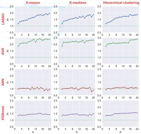 In the second line of Figure 8, it can be observed that the PIs are larger than that in the first line with a certain K value and clustering algorithm. This means that clustering algorithms can improve the performance of SVR models more significantly compared with the LASSO regression. It can also be found that PI increases gradually with the increase in K, while this trend is not that significant when K is large. The reason for the great improvement in integrating clustering algorithms on top of SVR is explained as follows. First, the general benefit brought by clustering is that data in each group could have a high similarity, which is favorable for regression. Second, clustering algorithms can divide the original data into different groups so each group has a smaller amount of sample. This is very favorable for SVR because it does not need all the data to find the hyperplane. In addition, a smaller amount of data can avoid the problem of high mapping dimensions for the kernel function. Thus, better performance and strong generalization ability can be obtained.