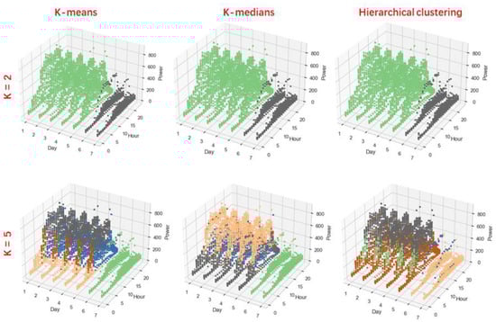In summary, the performance improvement by integrating clustering on different regression models from high to low is SVR, LASSO, XGBoost, and ANN. For the comparison of columns, there is no significant difference between these three clustering algorithms (K-means, K-medians, and Hierarchical clustering). More work is then conducted to find whether it is because of the high similarity among the results of different clustering algorithms. Table 4 shows the maximum and minimum amount of data in clusters when K = 2, K = 5, K = 10, and K = 20. Figure 9 also illustrates the result when K = 2 and K = 5. It can be found that when K = 2, all the methods can properly divide the data into working day data and nonworking day data. That is also the reason why there is a great performance improvement when K = 2 compared to when no clustering method is used (shown in Figure 8). With the increase in the number of clusters, the result of Hierarchical clustering especially shows a great difference from the other methods. This means that different unobvious patterns can be found by different cluster methods. These new patterns can also improve the prediction performance of the ensemble model. However, the performance improvement is not that significant compared with the case when the obvious patterns are found (i.e., working day and nonworking day).