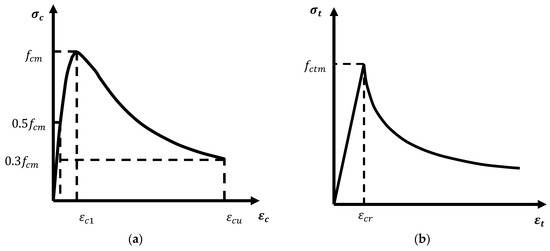 where elastic strain at the peak stress; the total strain; plastic strain with stiffness degradation; the damage factor; the tension or compression stress; is either the tensile or compressive strength of concrete as appropriate. The values of the concrete damage parameters are suggested based on [39,40,41,42,43]. The parameters are introduced in Table 2.
