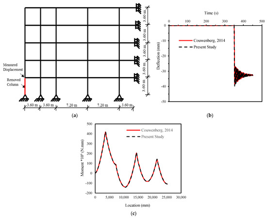 A five stories, 3.6-m reinforced concrete 2D frame that had previously been numerically verified by Couwenberg et al. [44] using ABAQUS software was used herein to validate the numerical model’s ability to simulate nonlinear dynamic time history under column loss. To reduce the analysis time of the FE model, only half of the frame was modeled. The rotation at the right ends of the beam were fixed. The beam column connections were assumed as pin connection. All dimensions of the frame are shown in Figure 2. The cross-section dimensions and reinforcements for the columns and beams are indicated in Table 3. All beams were subjected to uniform load 41.1 kN/m. The concrete was modeled using concrete damage plasticity model from ABAQUS software with grade C30/37. The reinforcements were modeled using an elastic-plastic material. Reinforcement grade was S500. The beam element is simulated using the Euler Bernoulli’s *BEAM element B23 which is suitable for the 2D frame analysis. The rebars in the beams and columns are represented as element property within the beam elements using *REBAR command. The frame view is shown in Figure 2. The load displacement relation at the node above the removed column was monitored. The maximum moment for the beam at the first floor was captured. The results show good agreement between the present study and Couwenberg et al. [44] as shown in Figure 2. Thus, the numerical model of the presented study is capable of capturing the behavior of the progressive collapse.