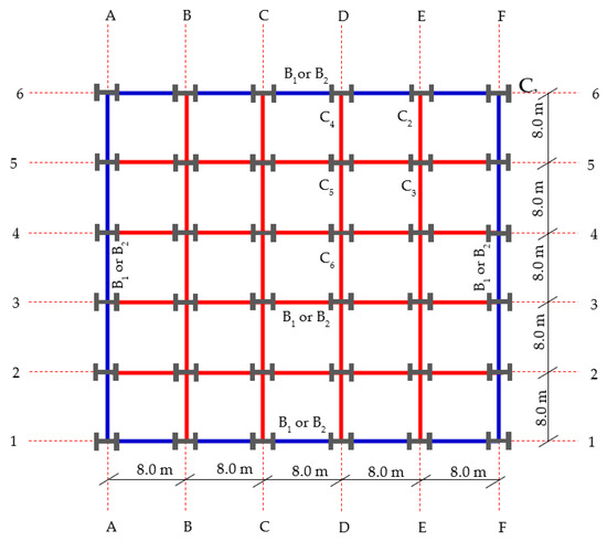 A 25 stories composite steel frame building with five spans in both directions is created using ABAQUS software. The input file is generated using a python script by the authors. The analyses are conducted to evaluate the response against progressive collapse. The building has a 3 m story height and 8 m span in both directions. The building is designed through the commercial software SAP2000 software against wind loads based on Eurocode 1-2005 [45]. The building is located in a zone with mean wind speed 35 m/s, terrain category (II), structural factor = 1, Turbulence factor = 1, and orography factor = 1. The design approach in Eurocode 1-2005 [45] is used for all elements. The lateral sway is controlled to be around 11.05 cm. The considered loads are the self-weight and superimposed load of 150 kg/m2 and the occupant load of 250 kg/m2. The damping is assumed as 5% mass proportional damping. Nonlinear dynamic analysis is implemented. The main steps are (a) applying the gravity load in static step, then (b) removing the column over a period of 20 ms according to the requirements of GSA [46], keeping the gravity load constant, and using dynamic nonlinear analysis. It should be noted that according to the (GSA) [46], the displacements are calculated based on the load combination (SSL + 0.25OL). Where SSL is the self-weight, and superimposed load and OL is the occupant load applied to the structure. The lateral load is resisted by X-bracing. The slab thickness is 180 mm. The mesh size is studied and selected to be finer around the areas of interest to ensure that the response is accurately determined. The columns and beams cross-section dimensions are shown in Table 4. The elevation and the plan of the model structures are shown in Figure 3 and Figure 4, respectively.