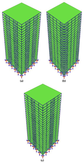 3D view of the building with various bracing locations (a) Bays (2, 4), (b) Bays (1, 5), and (c) Bay (3).