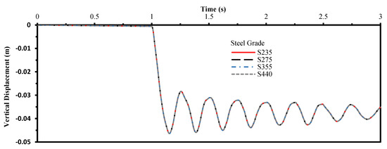 Four grades of steel are selected which are S235, S275, S355, and S440. The corner column C1 is removed from the first story. The vertical displacements are vibrated with a peak value of 46.40 mm for all steel grades. The percentage of increase in axial forces for the nearest corner, exterior, and interior columns to the removed column are 9.12%, 57.79%, and 13.056%, respectively, for all steel grades. The maximum equivalent plastic strain is rest at a maximum value of 0.00449. The peak moment and corresponding axial force for the beam above the removed column are almost 9.28 m.t and 35.5 ton. The results are almost identical for all steel grades. Figure 5 shows the history of vertical displacement above the removed column.