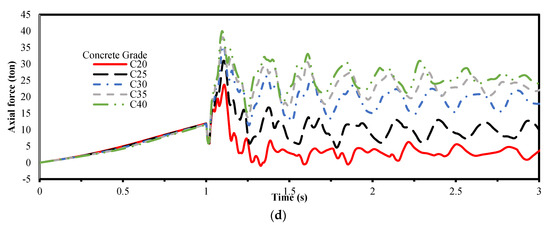 Five grades of concrete are selected which are C20, C25, C30, C35, and C40. The various results due to the removal of column C1 shown in Figure 6. From these results, it can be observed that the vertical displacements are decreased with the increase of concrete strength grade. The maximum equivalent plastic strain has a range between 0.00185 and 0.0172793 for various grades. The peak value is decreased with the increase of concrete strength. The tying forces and major moment in beams are increased with the increase of concrete grade of slab. The excessive forces are redistributed through beam with the increase of the concrete strength. The increase in maximum normal force is between (5.6–10.5%), (57.06–59.8%) and (8.09–13.9%) for corner, exterior interior columns near to the removed column.
