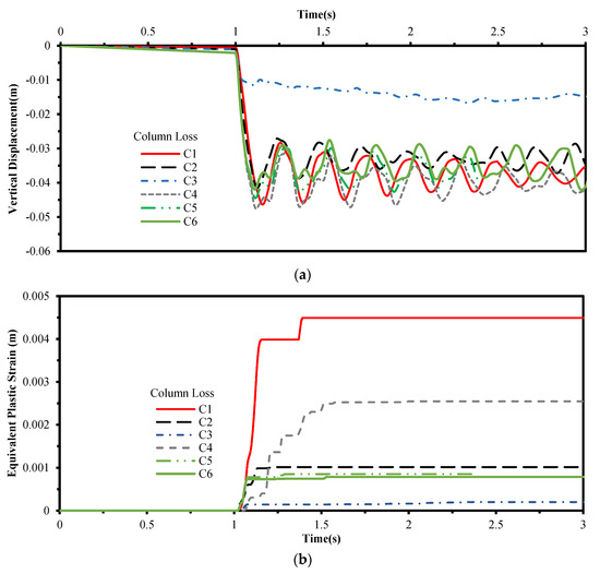 (a) Vertical displacement history, and (b) equivalent plastic strain history.